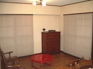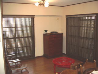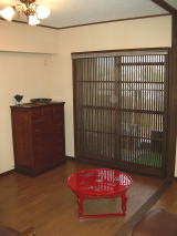 マンション最上階で風通しが良いため、夏場ほとんどエアコンなしで過せるというM邸。見た目にも涼しさを演出するため、格子戸や簾を利用し、古民家風の清涼感をかもし出している。