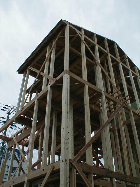 在来木造工法の場合、階数2以上の隅柱は、原則通し柱としなければならない。通し柱とは1階から最上階まで通った1本の柱のことである。また、3階建ての場合の1階の柱の断面は、原則13.5cmを下回ってはならない。