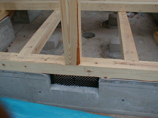 換気口の上に柱がのっている。荷重が作用しやすい換気口上に柱を固定してはならない。また、柱と土台は接合金物によってしっかりと緊結する。