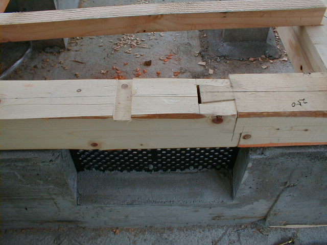 換気口の上で土台の継ぎ手を行っている。換気口上での継ぎ手や仕口は避けなければならない。また、継ぎ手を行う場合は、雄木側の土台と基礎とをアンカーボルトで固定する。